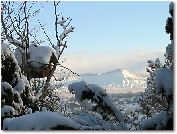 I shot this photograph from my deck in January 2004. To enter this into the Palisade Art Lovers Show (PALS), I got a large print from Snap Photo, matted it, and framed it. It was such a fun process. It was the first time I’d ever done that, and the first time I’d entered a photograph in a contest/show. Now I have this hanging on a wall in my house. I liked the composition of this one so much.