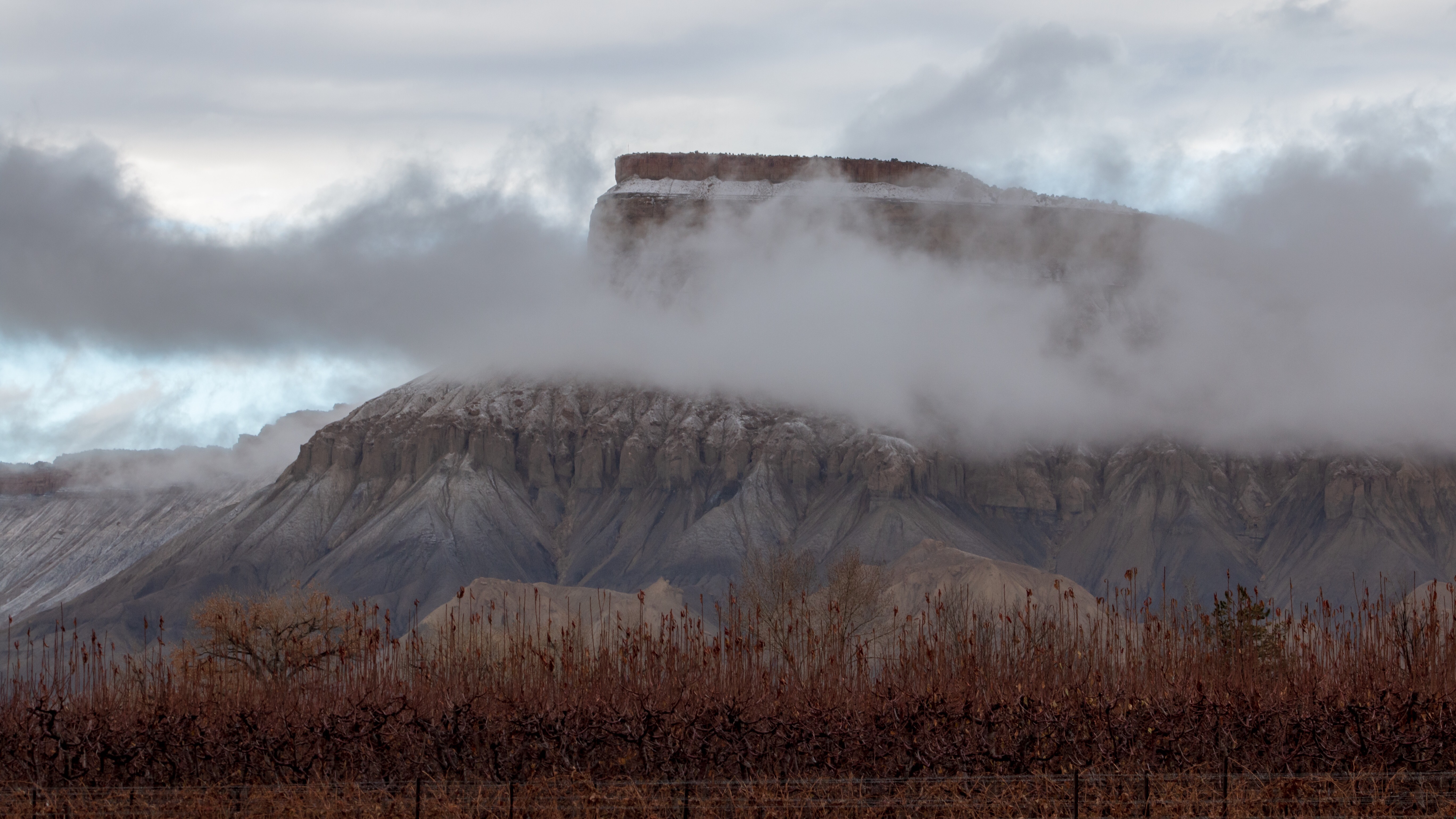 A few short weeks ago this same picture was full of rich blues and browns and colorful fall leaves covering the surrounding trees. I love weather — any kind. We have so many days of sunshine here in the Grand Valley of Western Colorado, that the clouds, the rain, the snow, and anything that breaks up the monotony, is welcome. (One website says 245 sunny days, another says 240.) Don’t get me wrong, I love the relatively temperate climate here, but there’s no drama in that. I think it’s a nice break when a storm pushes through. And, of course, I have a birds eye view.