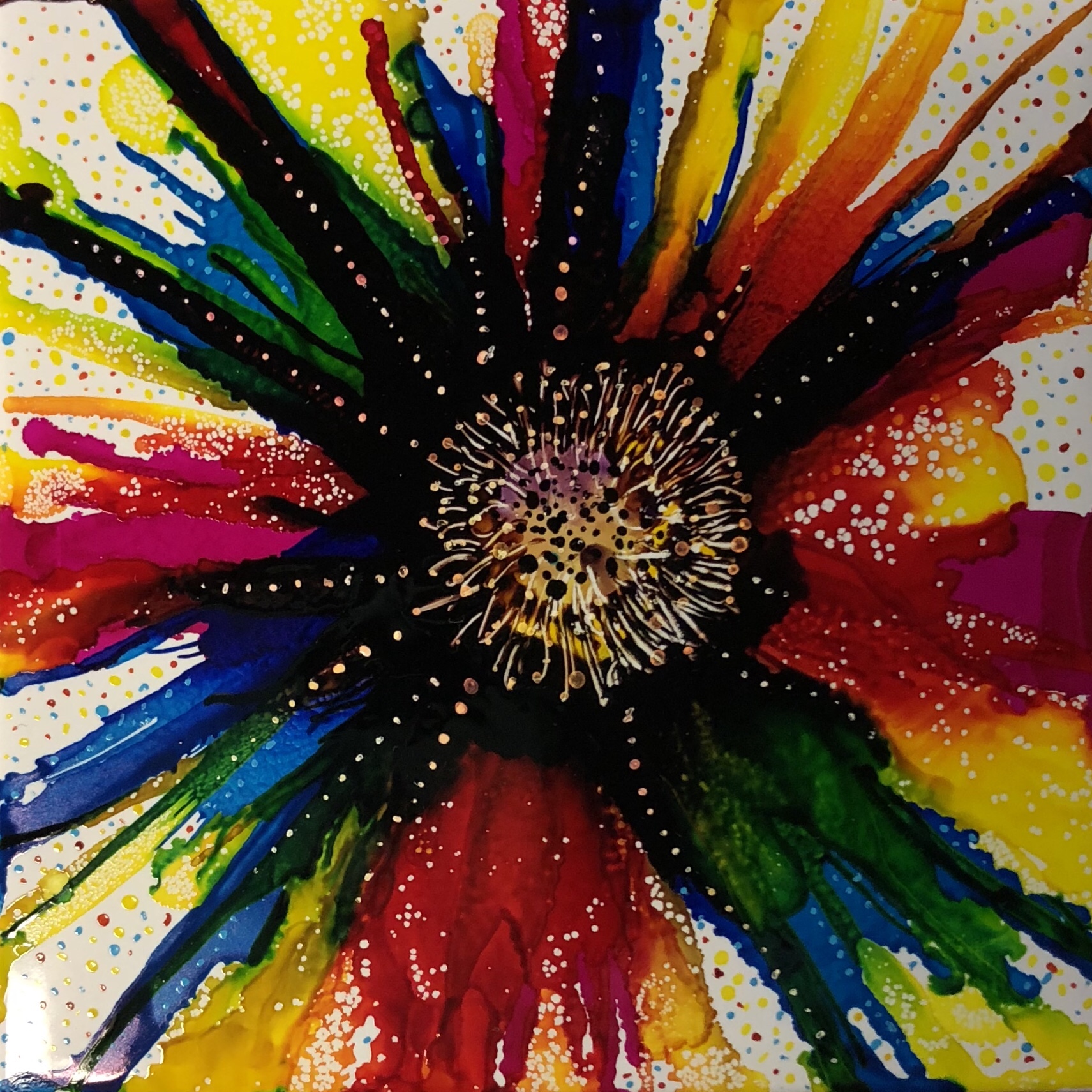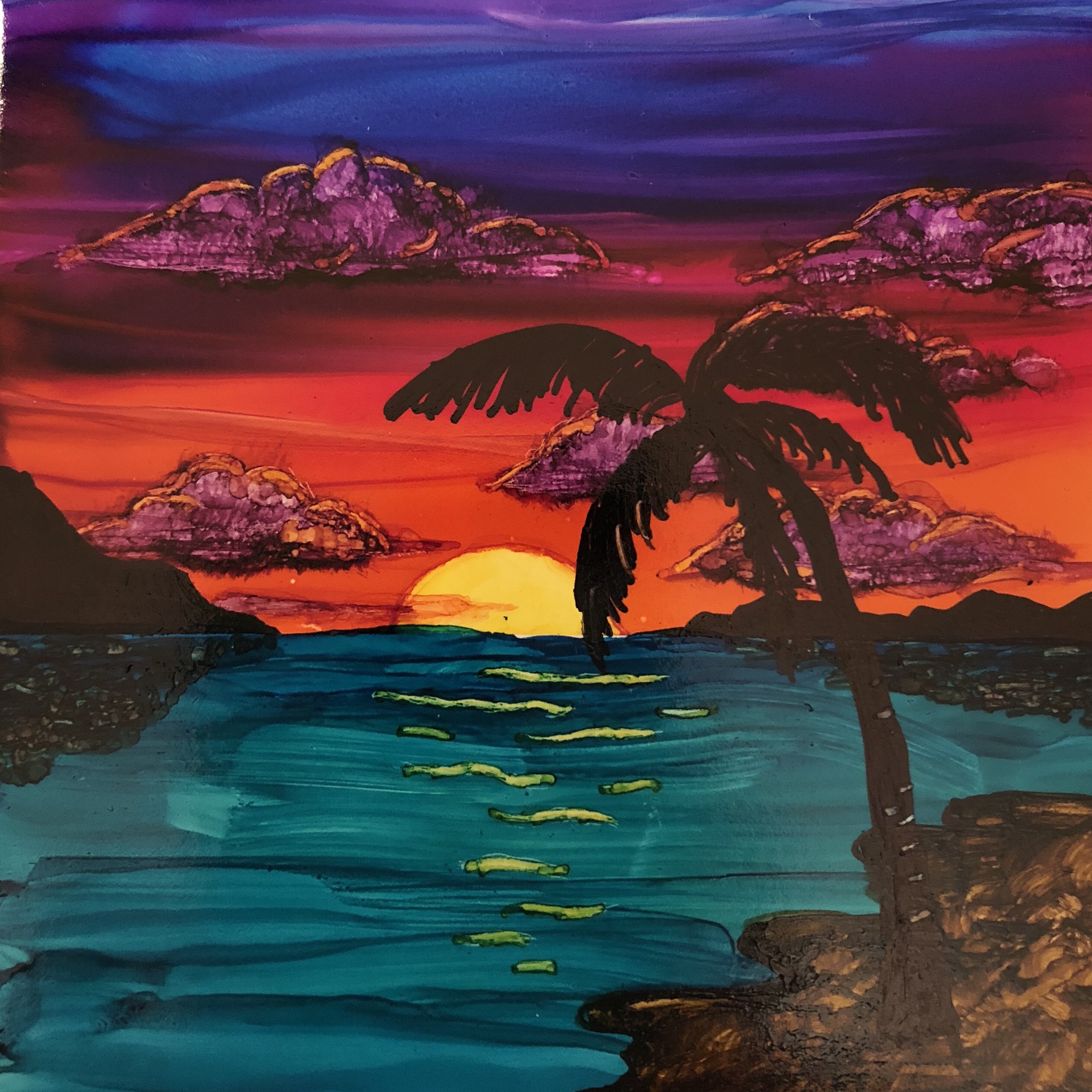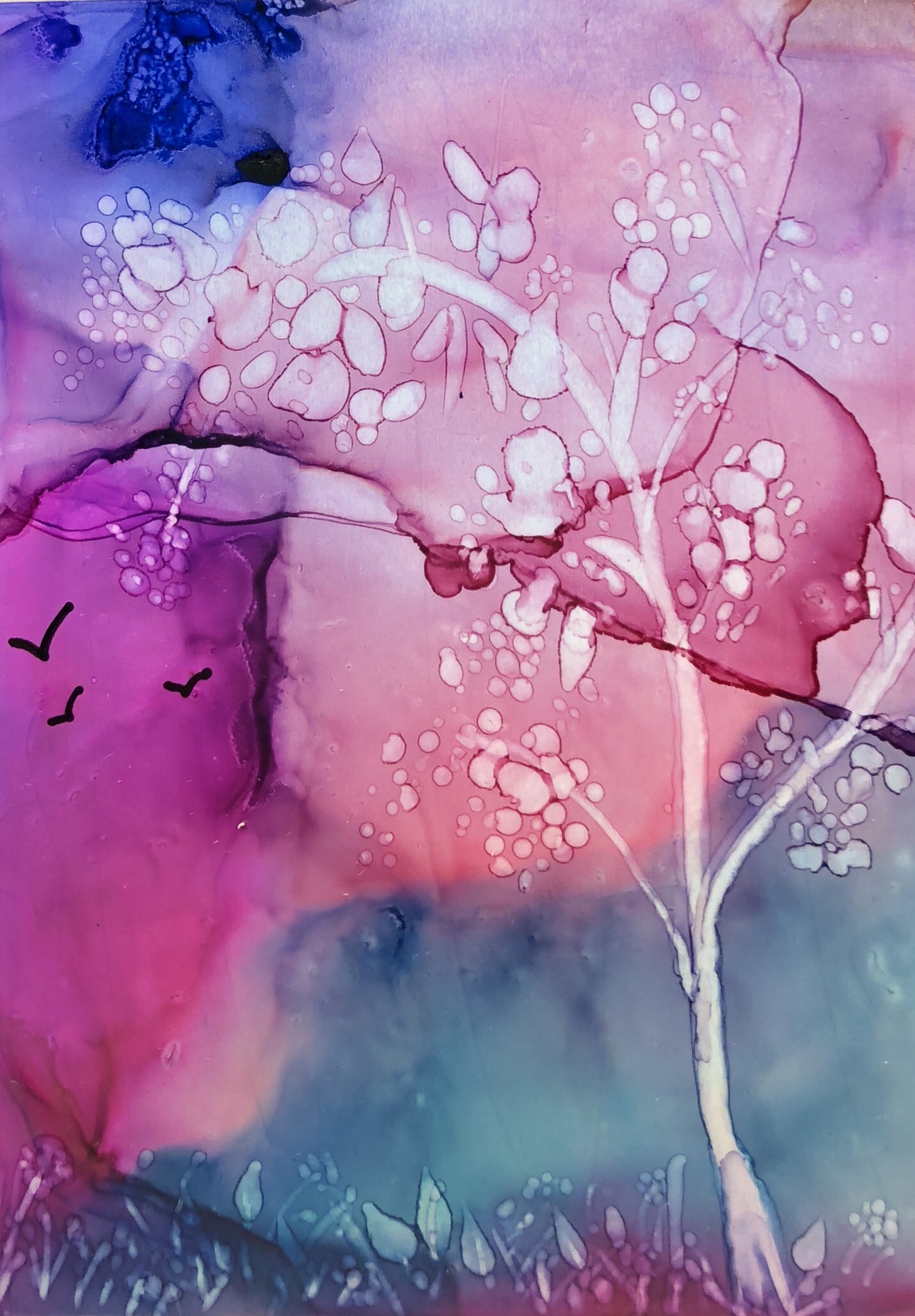 For those of you not familiar with alcohol inks, they’re basically alcohol based inks — they respond to alcohol in somewhat the same manner water colors respond to water. It IS different from watercolors. For instance, if you drop alcohol into a painting, the color on the surface will bloom — as in the picture below. The spots on the tree are created by dabbing alcohol on the inked surface. You can also use alcohol pens, like Copic pens or even Sharpies. In fact, you can use Copic ink refills as the ink. What I use are Jacquard Piñata inks and Tim Holtz Ranger inks, a painting tool filled with alcohol, a Copic colorless blender, and paintbrushes. These inks work best on non-porous surfaces, like tiles, acetate (Dura-Lar), or Yupo. I have also used photographic paper. I’ve seen tutorials where foil was used that gave the art a stained-glass type appearance.