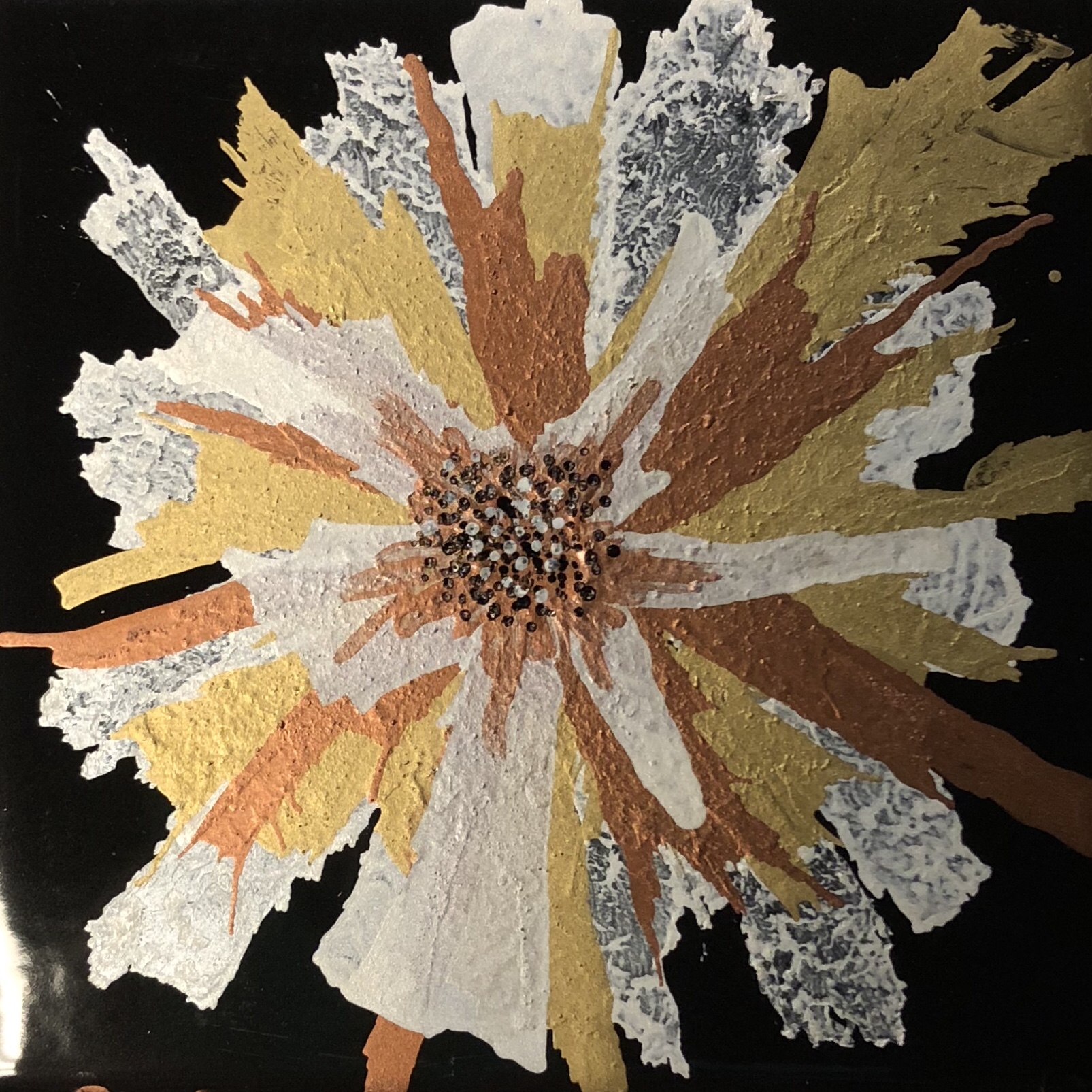 I went to a class at Seasons to Follow in Downtown Grand Junction, where I was shown how to use canned air to make a flower on a 4 x 4 tile. I though those turned out kind of interesting, but they don’t look a lot like what I was being shown. I have trouble controlling the air. I compensated for my ineptitude by making details in the middle of the white flower/black tile, and putting dots and lines all around the one on the white tile.