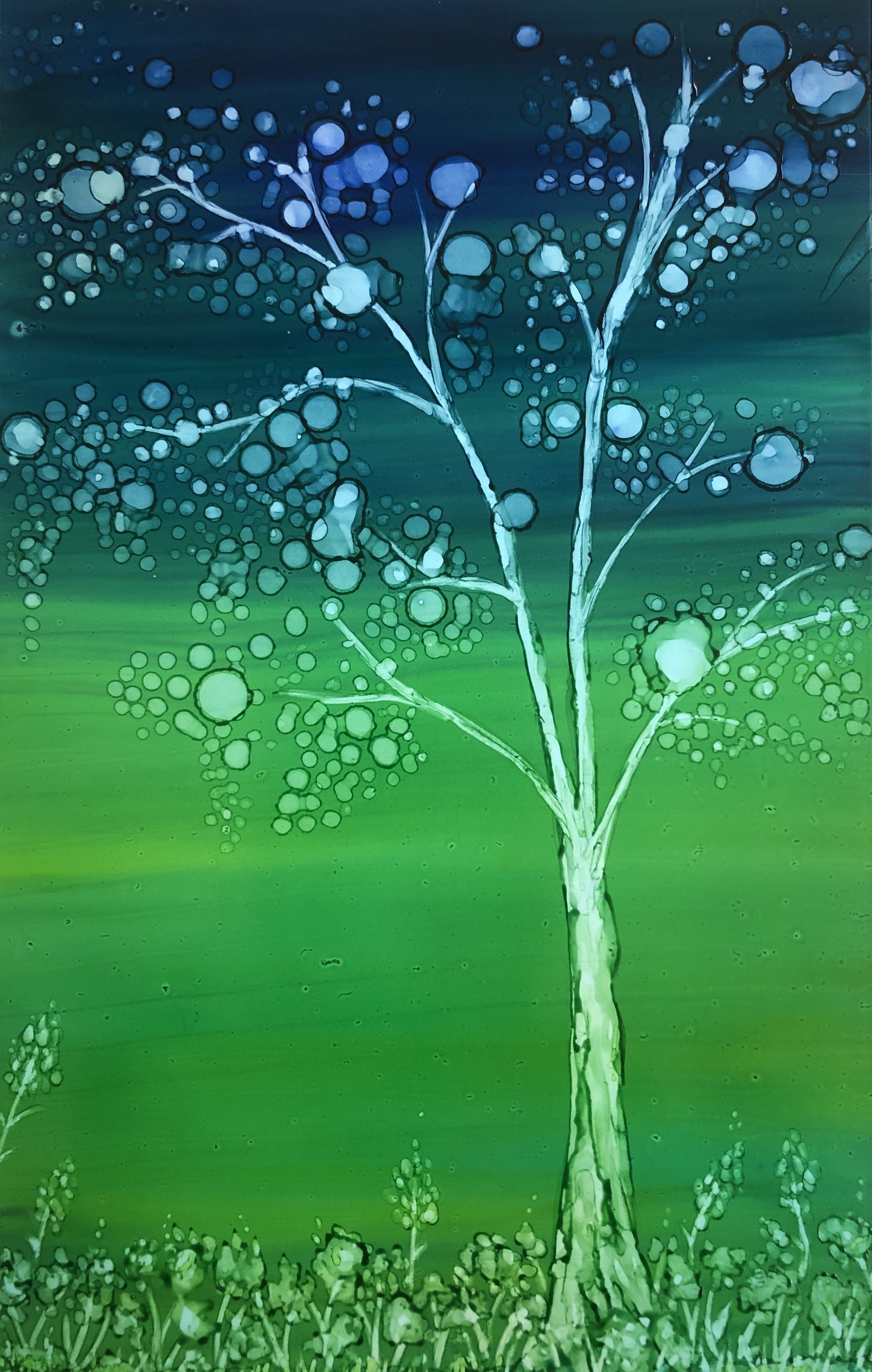 This is my latest and it’s one I think I will frame, eventually. This is Tim Holtz Ranger inks on Yupo, using a paintbrush to spread the ink, a smaller paintbrush to dab alcohol on the tree for leaves, and the Copic colorless blender pen for the trunk and branches and the vegetation at the bottom.