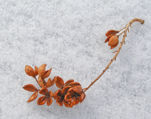 I won first prize at PALS (Palisade Art Lovers Show) in 2008 for this photograph. I took this photograph behind the Butterfly Pavilion in Grand Junction, Colorado. After a snowfall, the sky cleared and the sun appeared and I went out to find some pictures. This seed pod was perfect and in its dampness, a rich and shiny brown that caught my attention. I composed this shot by placing the pods on the cleanest spot of snow I could find.