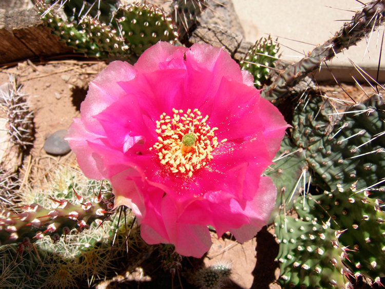 I saw it one day when I was stressed and in a real hurry to get out of here. As I was pulling out of the driveway, I saw a splash of color in my cactus planter. I stopped the vehicle, got out, got my camera and shot this picture of a gorgeous pink cactus flower.