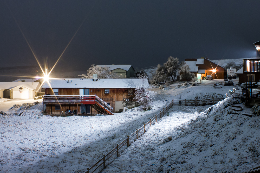 When I crawled out at 4am, it was still snowing. There were fewer lights then, but it was already brighter than the night before. In this picture, a streak of light running up the road, is barely visible. It extends from the white garage on the left to just past the house on the right with the star light—and it cuts through the car in the driveway. During the time the shutter was open, a snow plow drove up the road and through the shot. In this long exposure, the light on the vehicle was captured as it went past, but the snow plow doesn’t show up. What fun is that?!