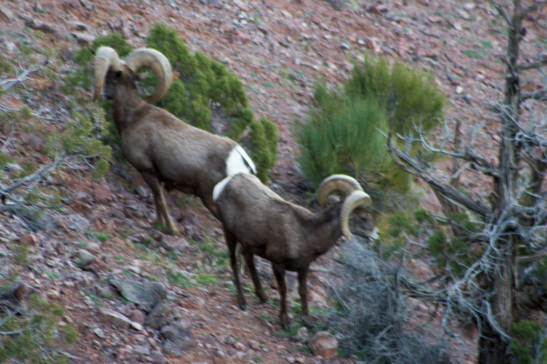 Lower Monument Canyon Trail, October 26, 2013.We were treated to a herd of desert bighorns—not just a couple, but more than a dozen. I had never seen that many at one time. Sighting the bighorns kept us in one spot for a long time; taking pictures and being really quiet. My camera didn’t do a good job of capturing them, but I did get proof I saw them! I took several long-distance shots when it was far too dark to get good pictures without a tripod. Shooting in RAW allows for changing the exposure in post-processing, but what I get is really noisy and not much use for anything but my own memories. I guess that has to be good enough. (My reasoning for not taking a tripod was because the information about the hike said it wasn’t necessary. Hereafter, a tripod will always be a necessary item on such an outing.)
